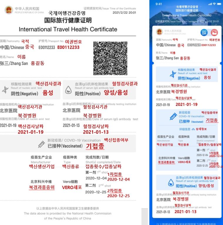 중국은 2021년 3월 9일 중국판 '백신 여권'인 '국제여행건강증명(國際旅行健康證明)'을 중국 메신저인 위챗(Wechat)과 연결된 미니 프로그램으로 3월 8일 공식 출시했다고 밝혔다. 백신 여권은 중국 메신저 앱인 위챗의 미니앱으로 만들어, 기존 앱처럼 앱 장터에서 내려받을 필요 없이 앱 속에서 새로운 페이지가 열리는 식으로 작동한다.
