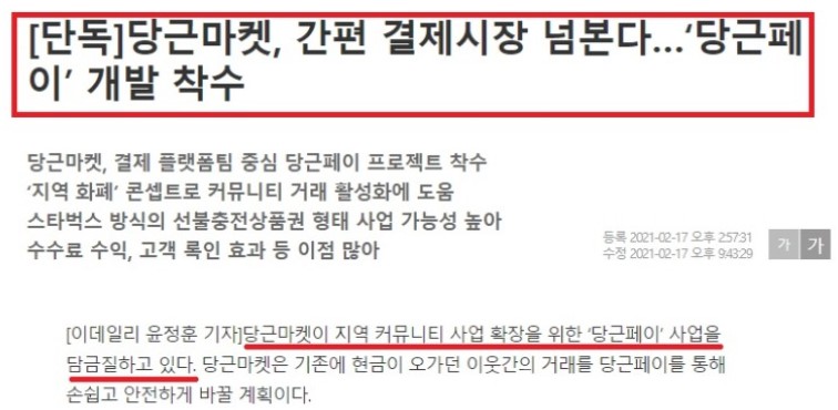 당근마켓은 현재 간편 결제시장을 넘보며, '당근페이'를 착수하고 있다는 기사가 올라왔다. 개인과 개인 간의 현금거래였어서 불안한 점을 개선하는 해결책으로 나온 것이다. 이런 점을 눈여겨보아서는 거래와 모바일 관련주로는카카오, 다날, NHN 한국 사이버결제, GS리테일 등이 관련 주식이라고 볼 수 있다.