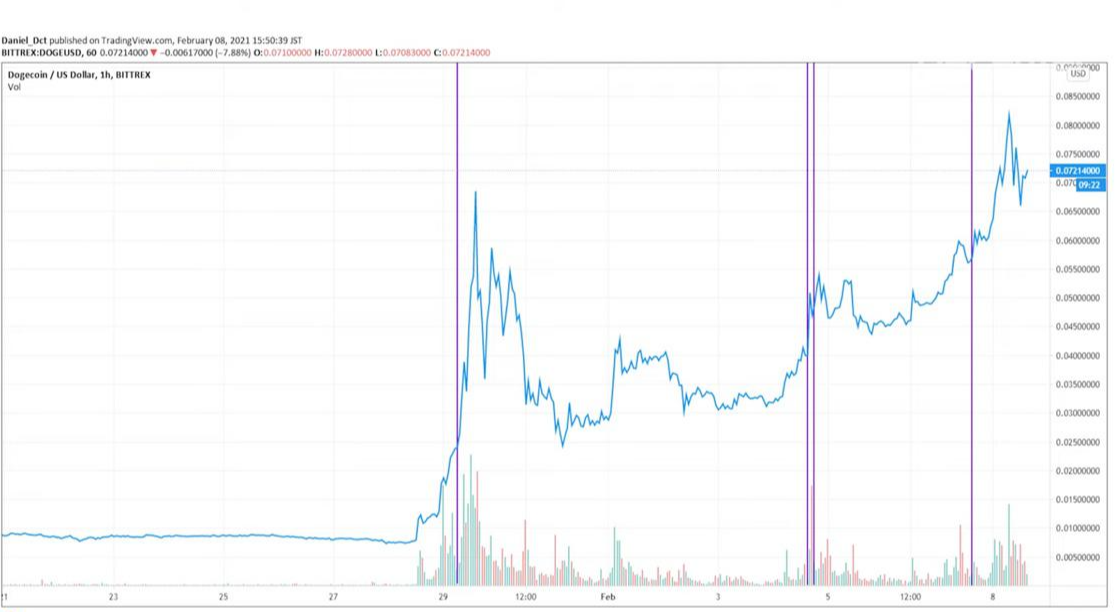 일론 머스크의 트위터 타이밍에 가격 차트에 반연한 그래프 모습이다. SNS에 도지코인을 반영할 때마다 가격이 대폭 상승하는 모습을 확인 할 수 있다. 현재 전기차의 점유율 독보적 1위인 테슬라를 도지코인으로도 구매할 수 있지 않을까라는 기대감도 존재한다.