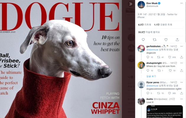 현재 비트코인 가격에 엄청난 영향을 미치고 있는 테슬라 CEO 일론머스크가 계속해서 도지코인에 대한 언급과 사랑을 보이고 있다. 이것을 아는 도지코인은 공식 트위터에 소개문 구를 올리기도 했다.