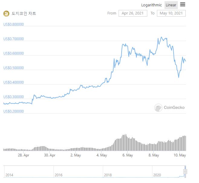 도지코인의 시세는 아래 그래프와 같다. SNL 출연 후 "도지코인은 사기다"라는 농담으로 급격하게 추락하는 곡선을 보였지만 최근 다시 소폭 상승하는 모습을 보여주고 있다.