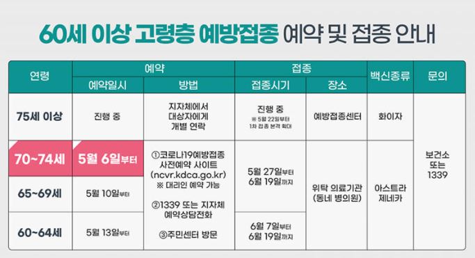 5월에는 60~74세 어르신들이 주 접종 대상으로 5월 6일 이후부터 70~74년생(1947년~1951년생) 예약이 실시되고 있으며, 5월 10일부터는 65~69세 어르신들도 대상이 됐다. 코로나 19백신 접종은 무료로 가능하다.